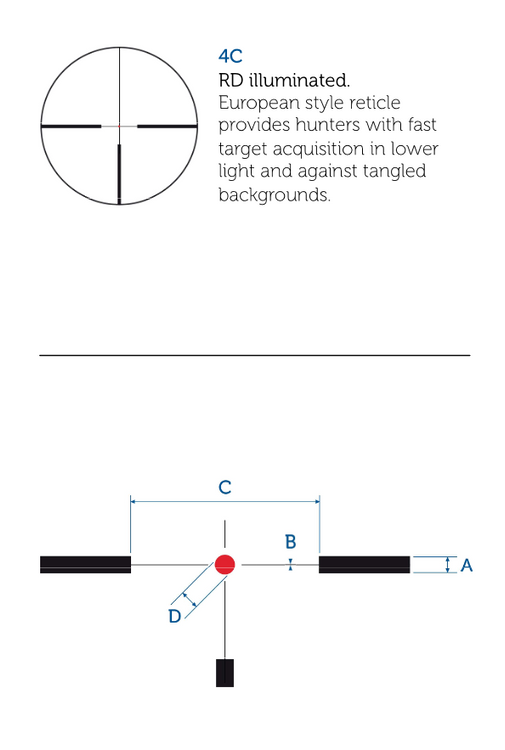 Siatka 4C z podświetlanym czerwonym punktem (RD) gwarantuje doskonałą widoczność w każdych warunkach. System oferuje 8 poziomów jasności podświetlenia, z możliwością szybkiego wyłączenia między ustawieniami.